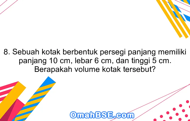 Artikel ini akan membahas tentang volume sebuah kotak berbentuk persegi panjang dengan panjang 10 cm, lebar 6 cm, dan tinggi 5 cm. Dalam matematika, volume kotak dapat dihitung dengan mengalikan panjang, lebar, dan tingginya. Mari kita cari tahu berapa volume kotak tersebut!